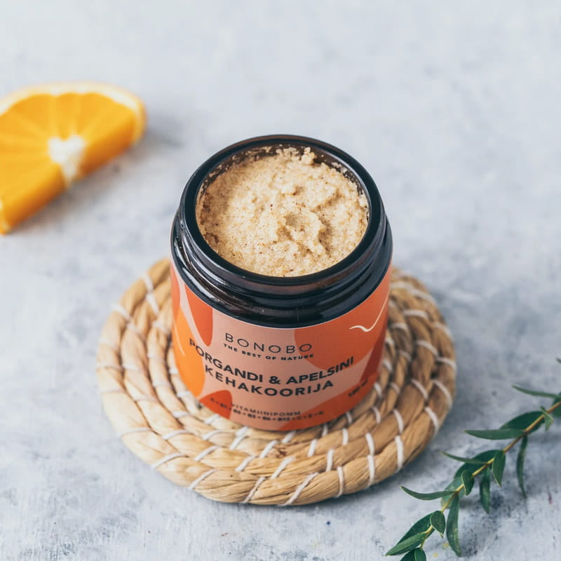 Product details: – Content: 120 ml – Texture: sugar base with creamy care – Ingredients: including coconut oil, shea butter, unrefined sugar, orange oil, carrot powder, vitamin E - Made in Estonia – Shelf life: use within 3 months after opening, store protected from direct sunlight