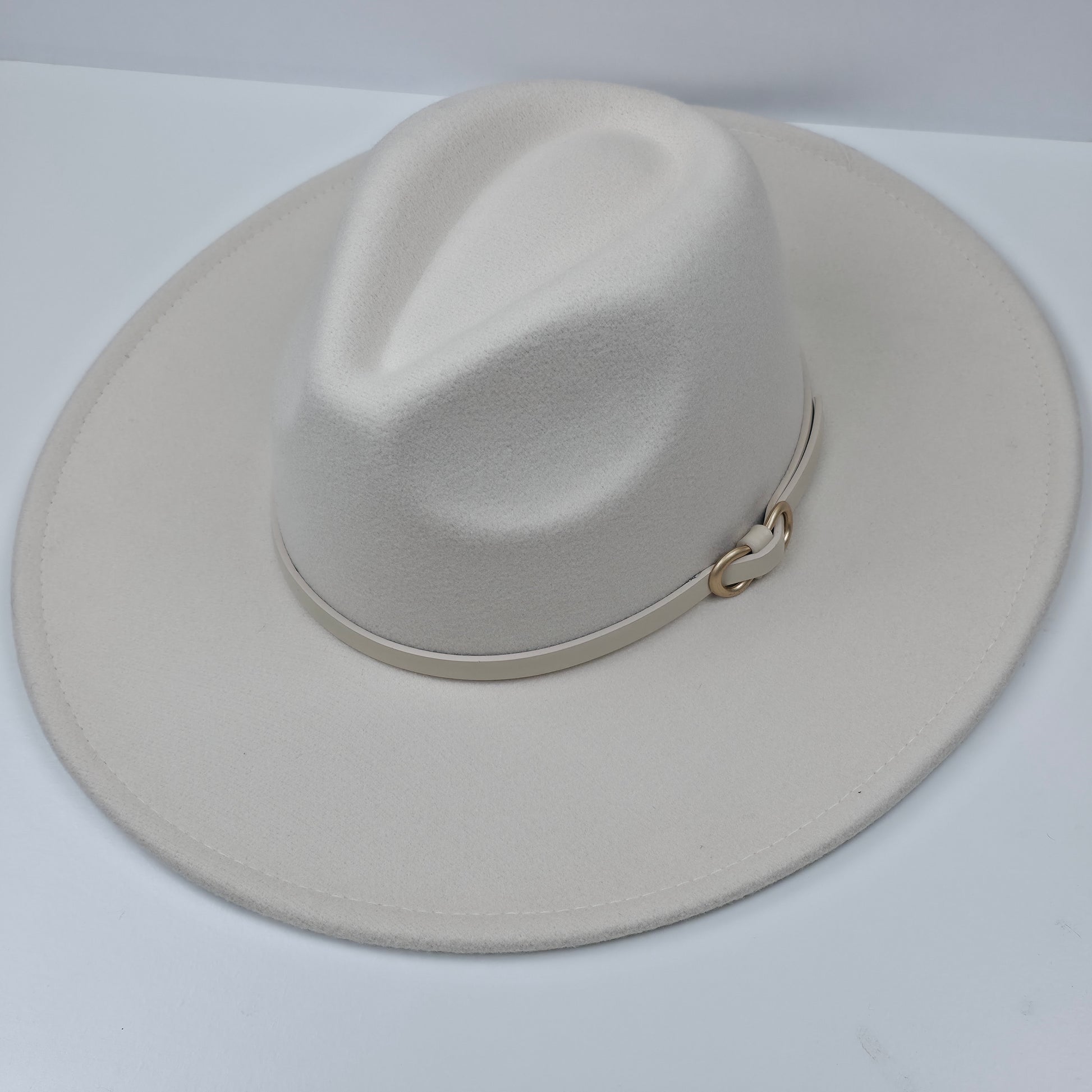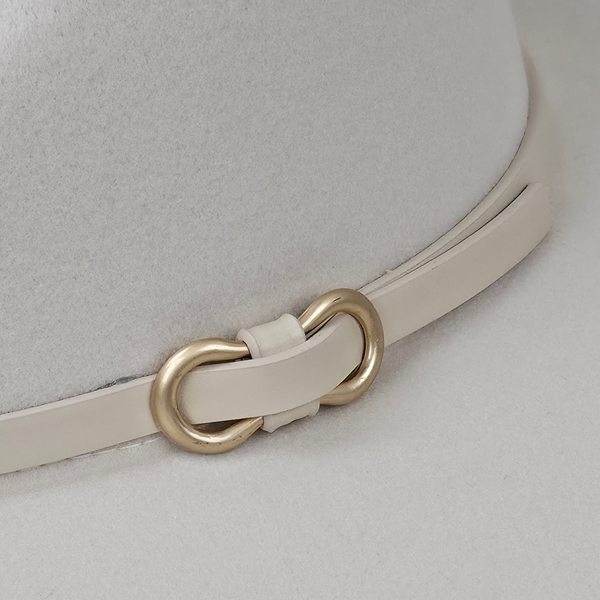 Make a stylish statement with the MICHELLE™ Felt Fedora Hat. Crafted from luxurious wool felt with a sleek, matte texture, it features a cream-colored leather band and subtle gold detailing. The minimalist design is timeless and easy to style with both casual and chic outfits.