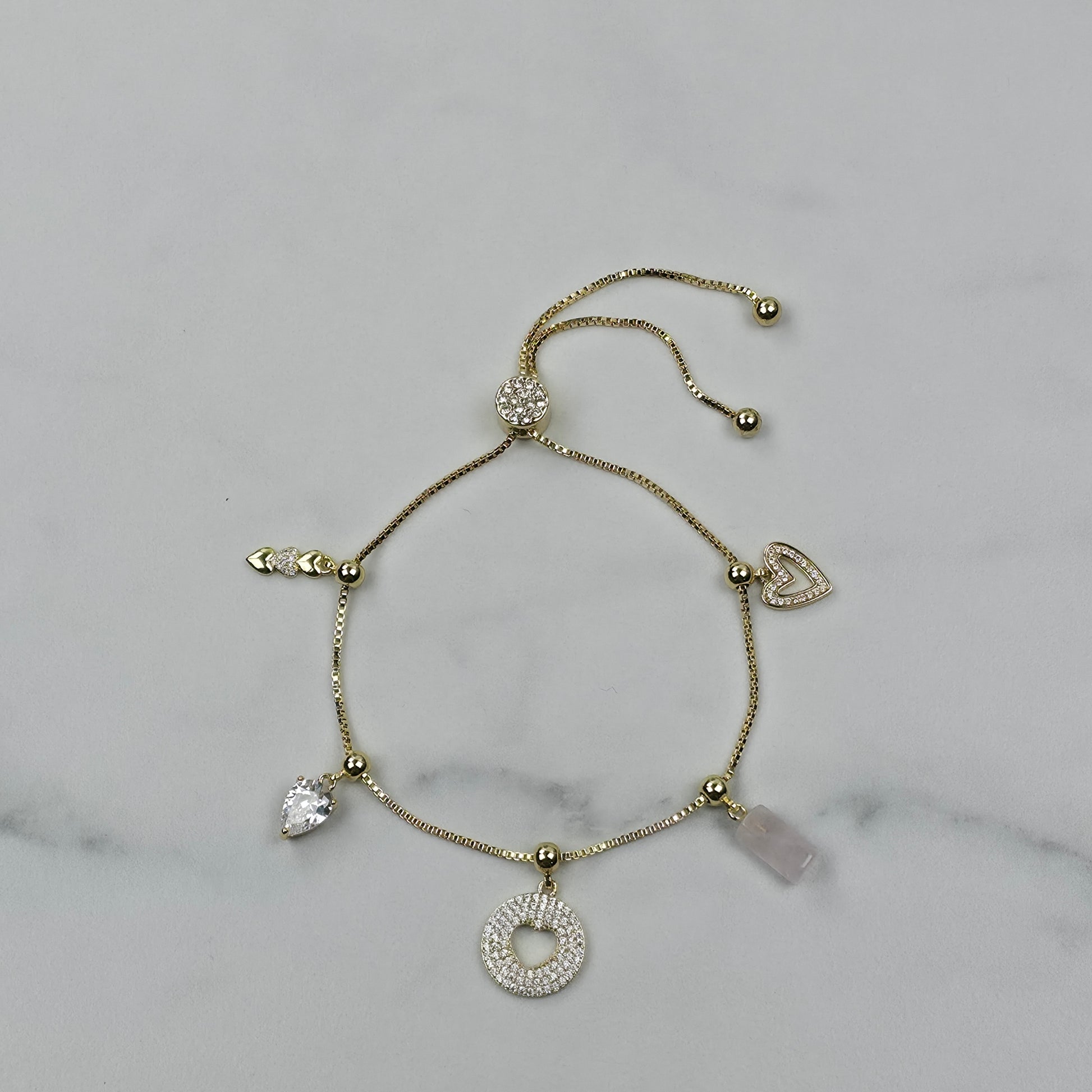 Waarom jij dit gaat waarderen: • Luxe mix van hart-, geometrische en strass-hangers • Goudkleurige afwerking met fonkelende details • Verstelbaar schuifslot voor een perfecte pasvorm • Tijdloos en elegant design — ideaal om solo te dragen of te combineren • Subtiele glans die elke outfit naar een hoger niveau tilt