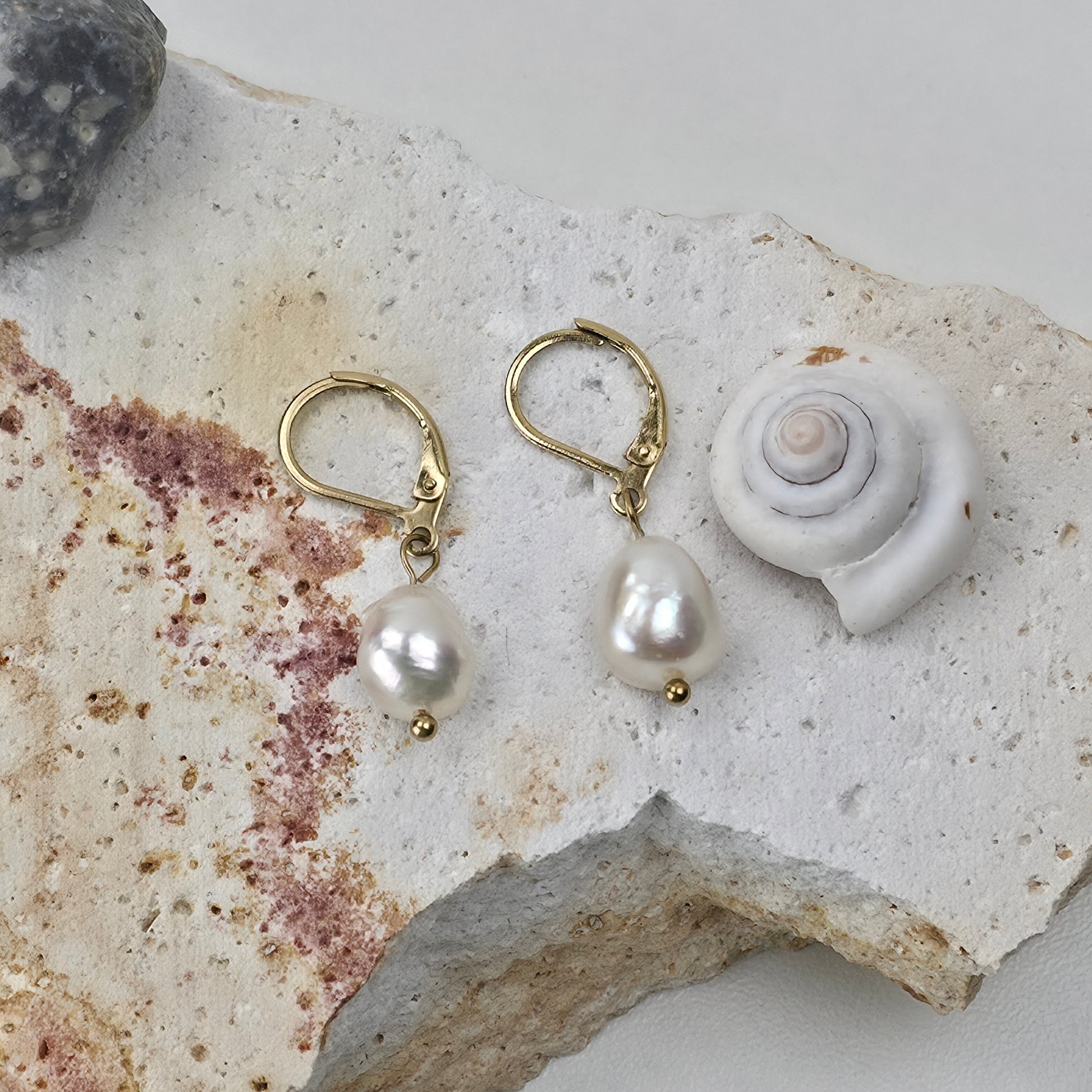 Productdetails: • Merk: IM • Type: Oorbellen (Dangle) • Materiaal: Roestvrij staal met goudkleurige afwerking & barokparels • Kleur: Goud & Parelwit • Lengte: ca. 2,5 cm • Vorm: Druppelvormige barokparels • Sluiting: Klassieke leverback (hefboomsluiting)