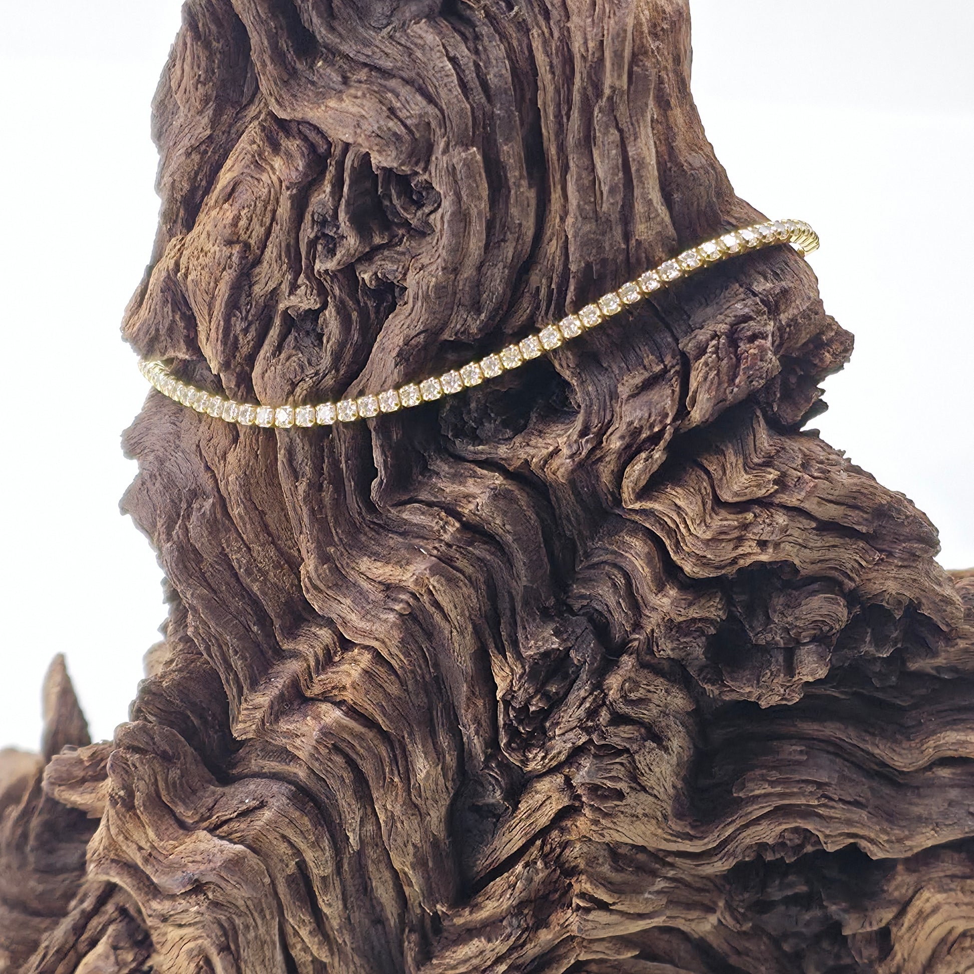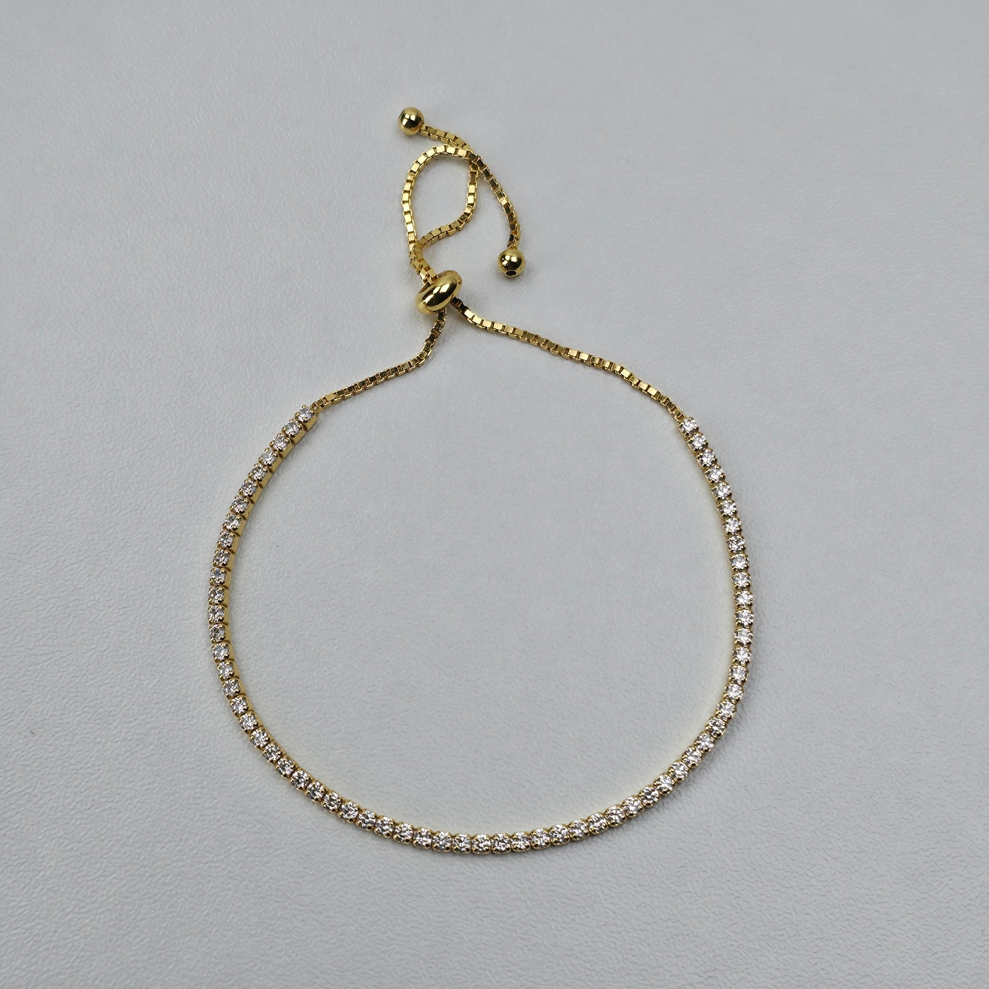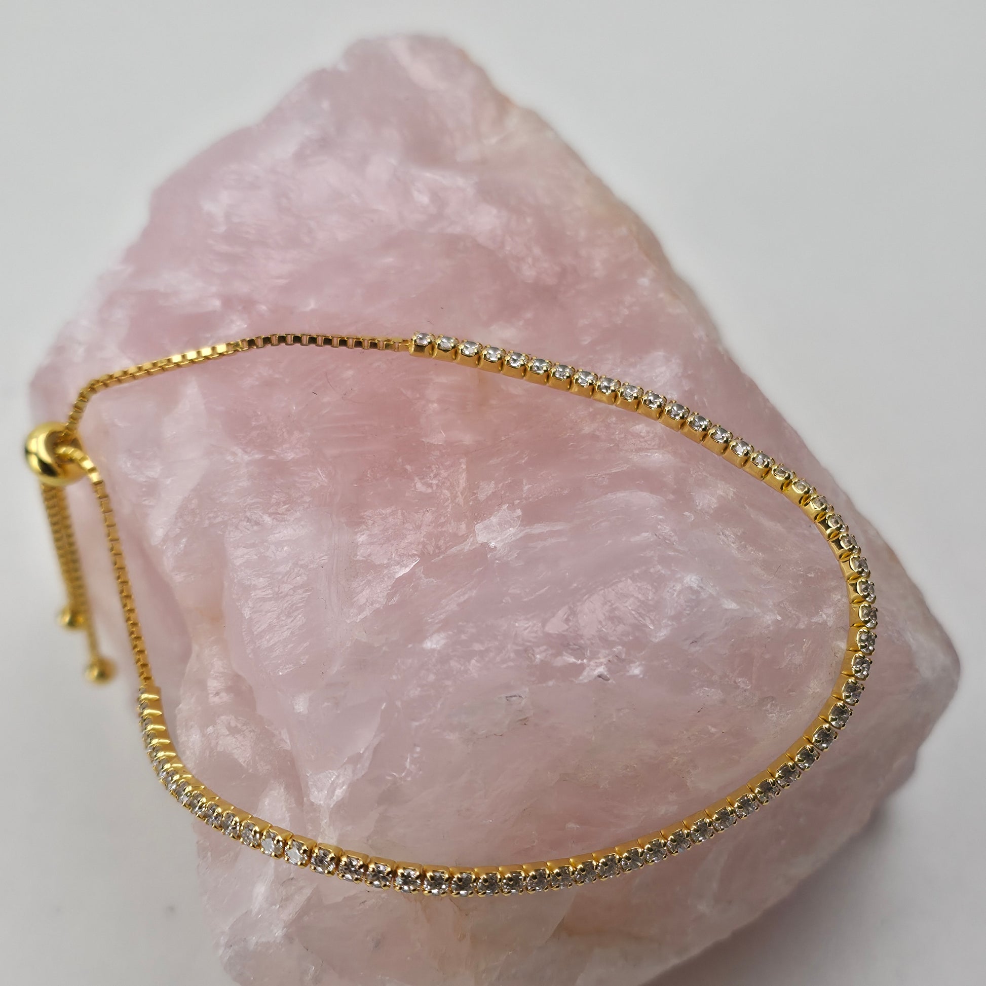 Waarom jij dit gaat waarderen: • Klassiek tennisarmband design met moderne uitstraling • Rij fonkelende strass-steentjes voor subtiele glamour • Goudkleurige afwerking die warmte en luxe uitstraalt • Verstelbaar schuifslot voor een perfecte pasvorm • Tijdloos accessoire dat moeiteloos combineert met elke stijl