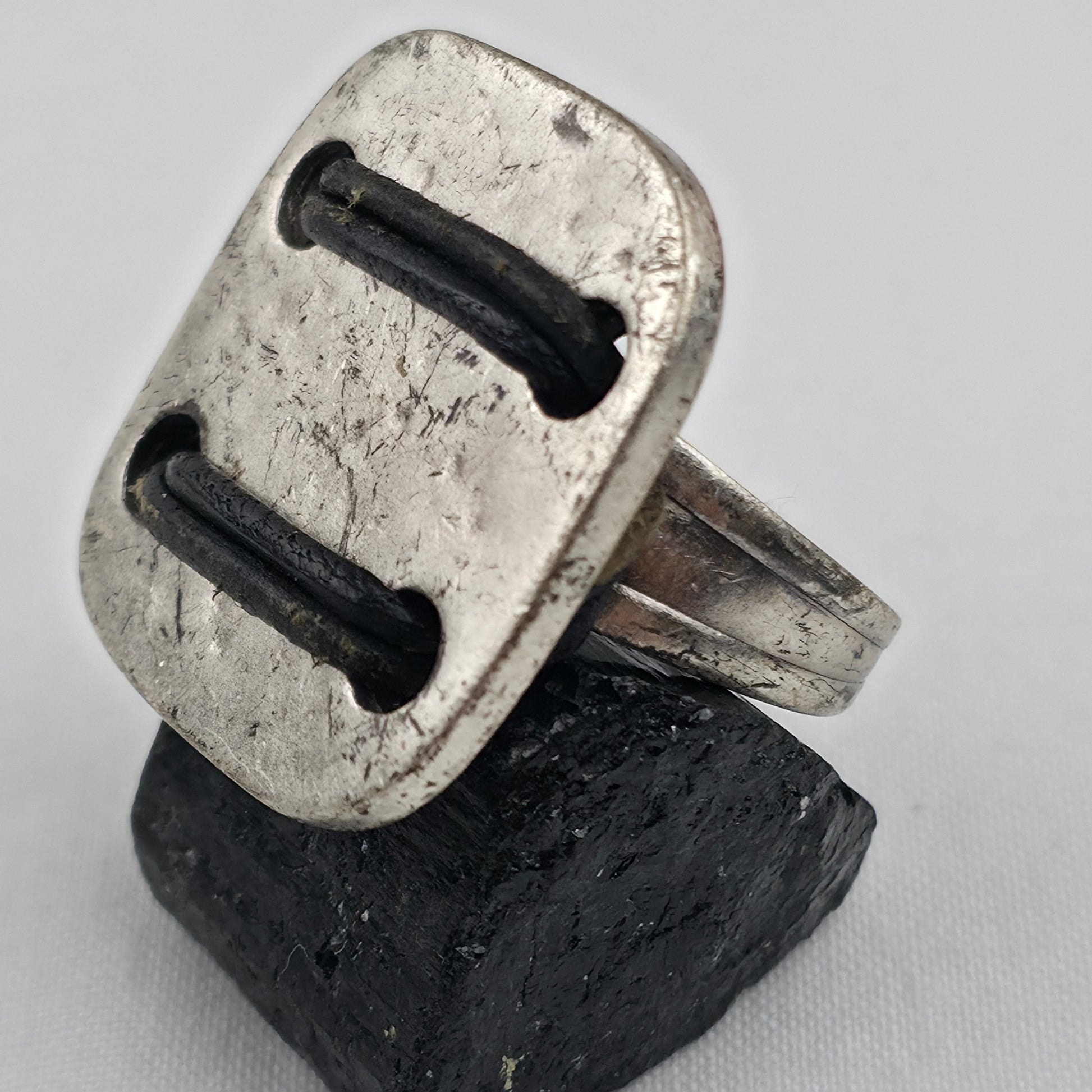 Beschrijving Deze handgemaakte ring heeft een stoere, minimalistische vorm met een vierkant ontwerp en twee zwarte leren stroken die door het midden lopen. De combinatie van metaal en leer geeft de ring een industriële, tijdloze uitstraling die perfect past bij zowel casual als moderne outfits. Door het robuuste karakter is het een opvallend accessoire dat elke look krachtiger maakt.