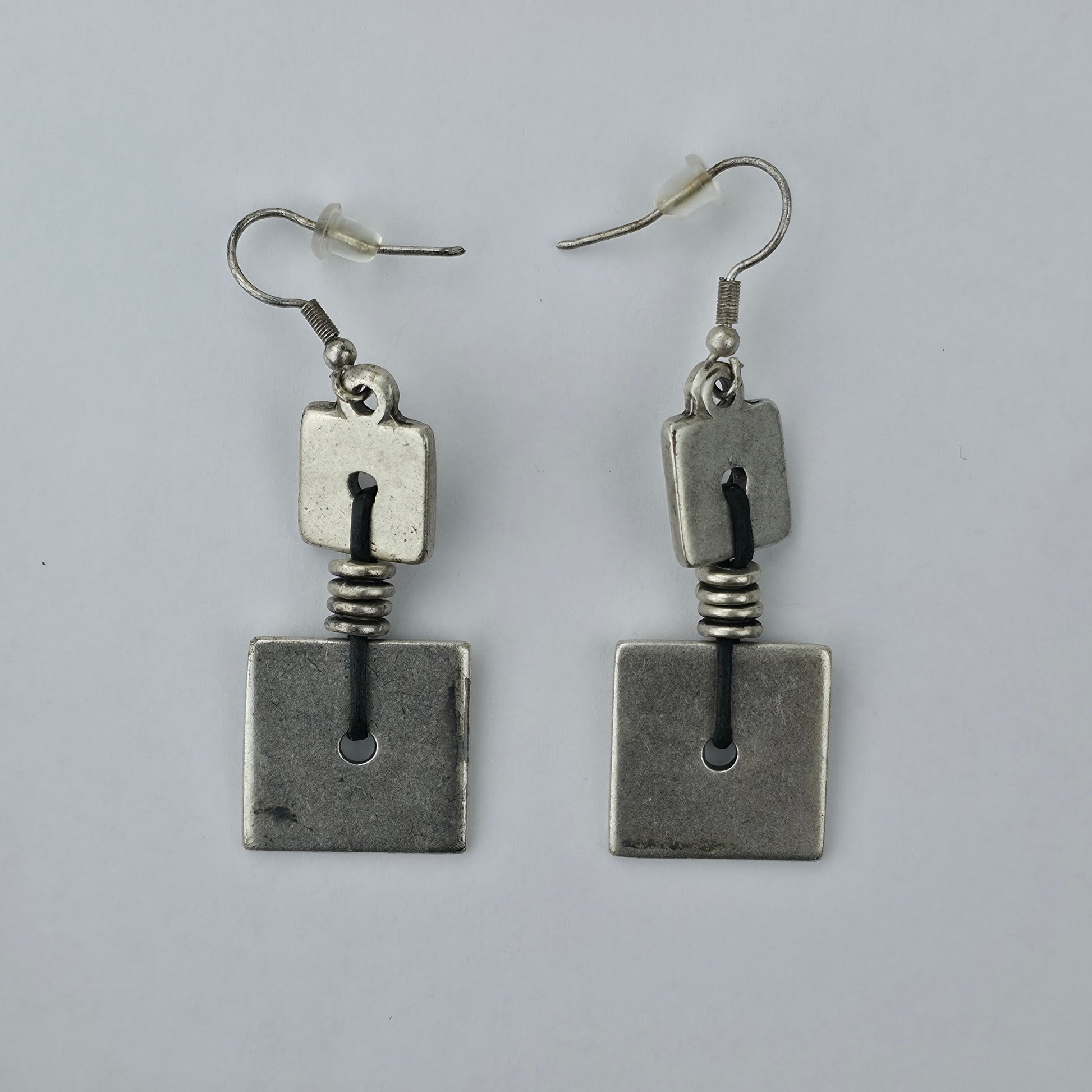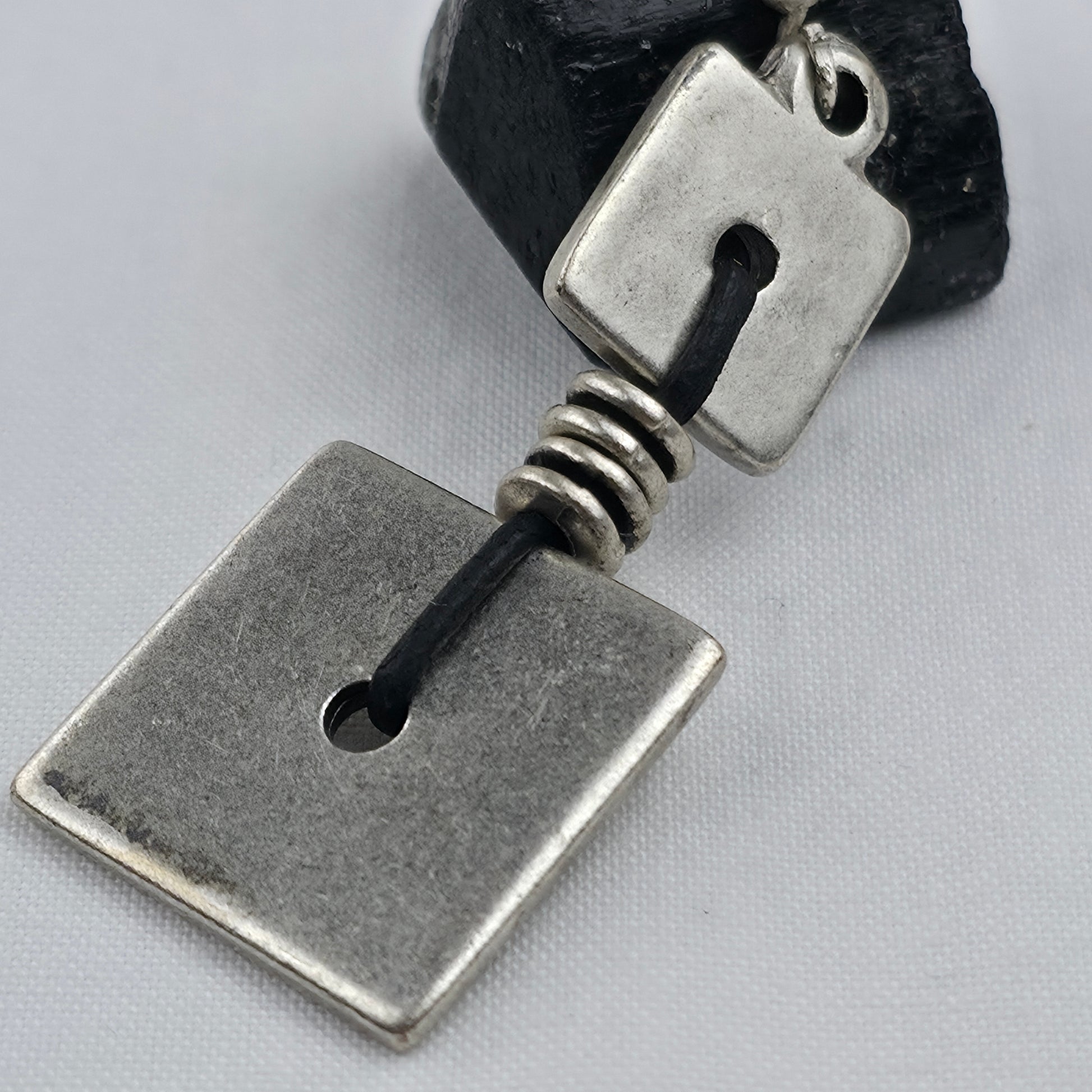 Deze handgemaakte oorhangers combineren twee zilverkleurige vierkante elementen die met een zwarte koordverbinding stijlvol met elkaar verbonden zijn. De subtiele geometrie en de licht ruwe afwerking geven de oorbellen een minimalistische, moderne uitstraling. Perfect voor wie houdt van unieke, artistieke accessoires die toch moeiteloos bij elke outfit passen.