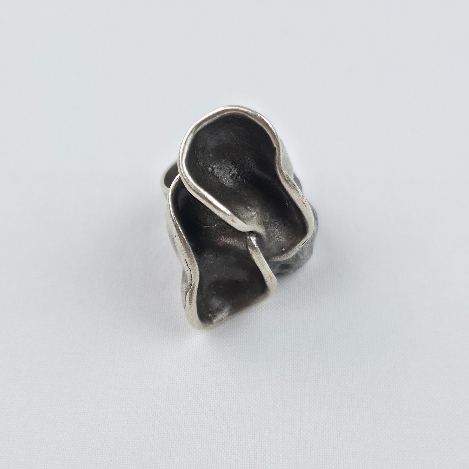 Beschrijving Deze handgemaakte ring heeft een unieke, organische vorm die doet denken aan gevouwen metalen lagen. De zachte rondingen en asymmetrische lijnen geven het ontwerp een artistieke uitstraling die perfect past bij moderne, expressieve stijlen. Een onderscheidend statementstuk dat zowel subtiel als krachtig oogt.