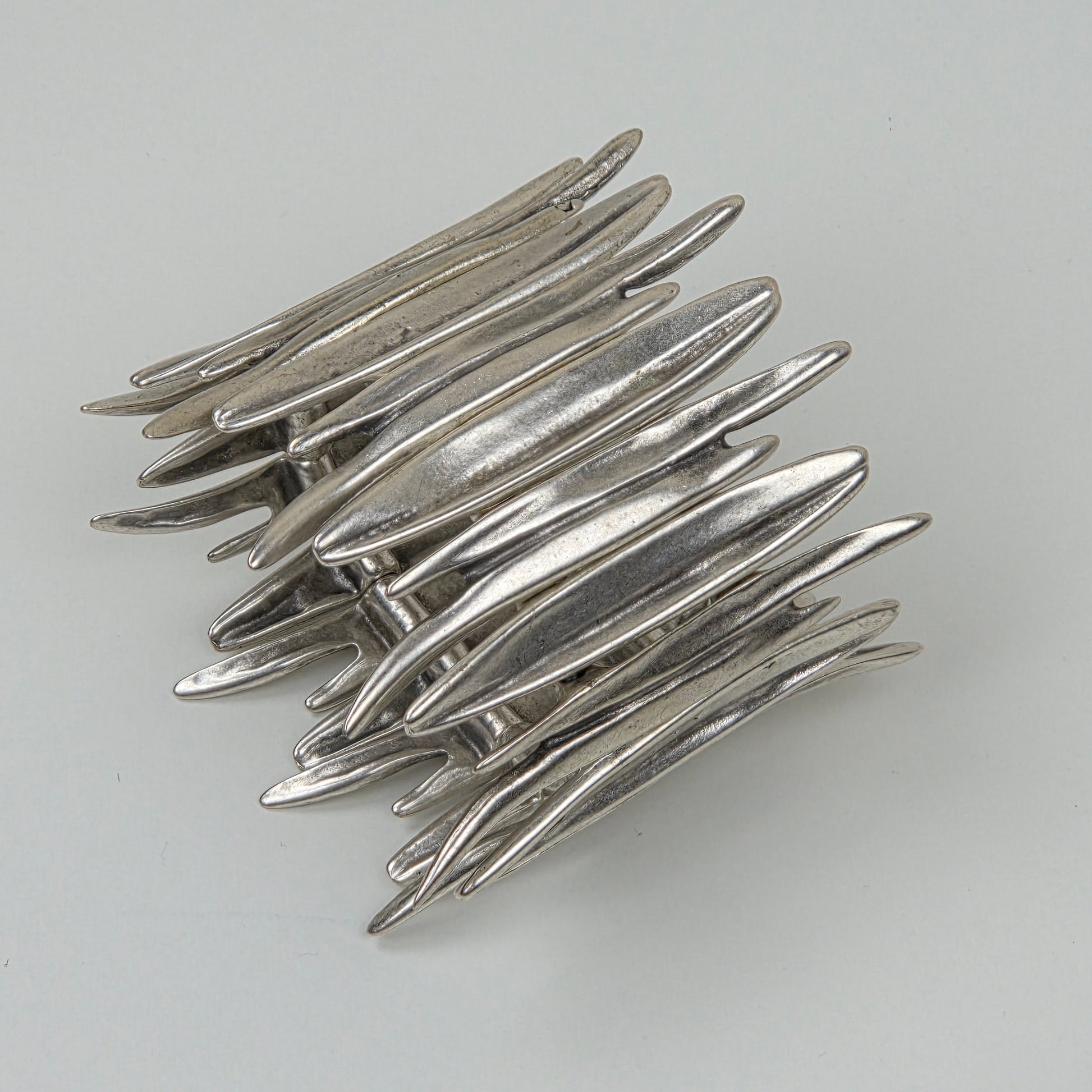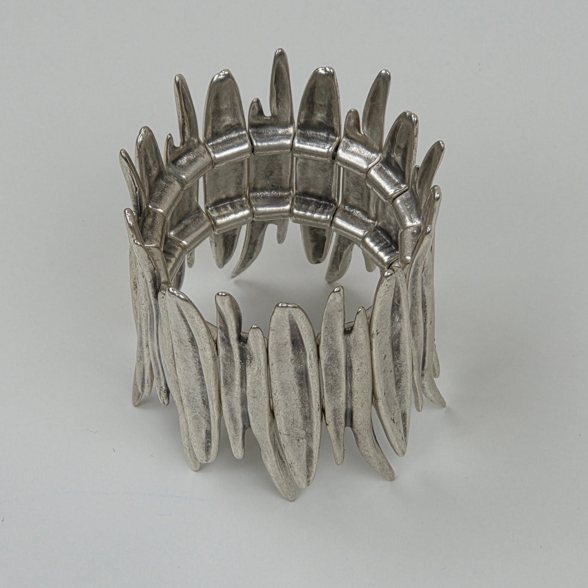 Introductie: De Hevi Brede Elastische Armband met sculpturale zilverkleurige segmenten is een krachtig statement piece. De langwerpige elementen creëren een opvallend, bijna architectonisch design dat direct in het oog springt. Dankzij de elastische constructie is de armband niet alleen stijlvol maar ook comfortabel om te dragen.