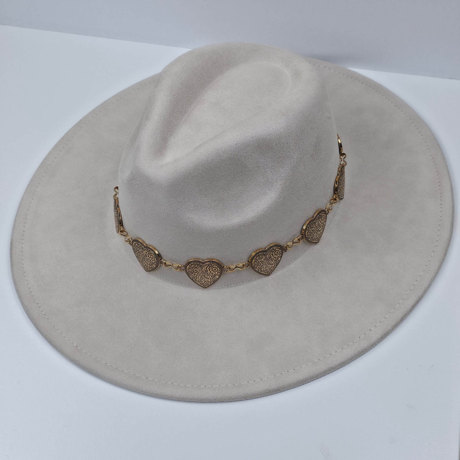 Maak je outfit compleet met de MICHELLE Suede Fedora Hat. Deze elegante hoed met brede rand is uitgevoerd in zacht faux suède en versierd met een verfijnde gouden kettingband met hartvormige details. Een stijlvolle mix van tijdloos design en speelse luxe, perfect voor speciale gelegenheden of als fashionable statement piece.