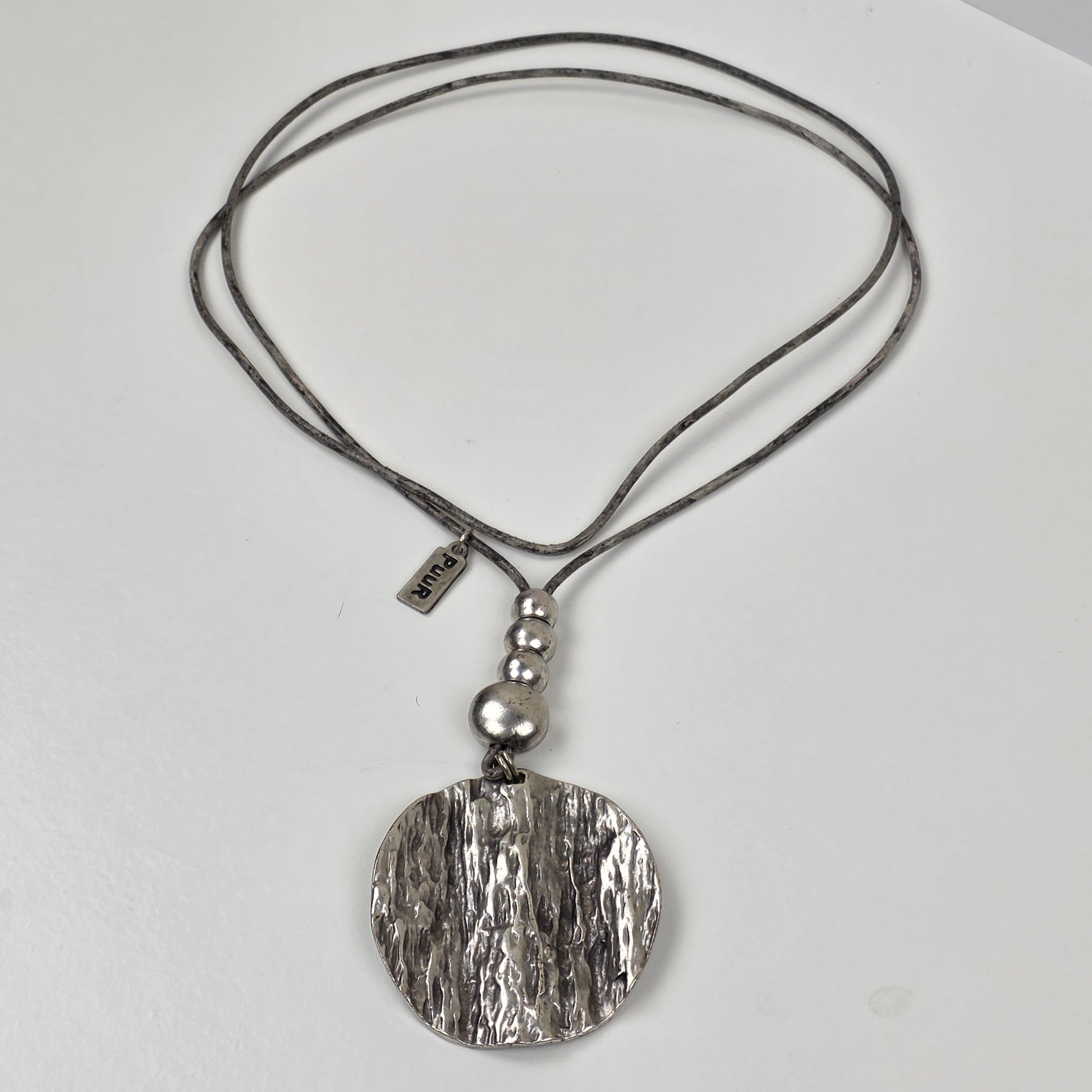 Introductie: De PUUR Grijs Koord Ketting is een handgemaakt sieraad met een krachtige uitstraling. Het grijze koord draagt een grote zilverkleurige hanger met gehamerde structuur, afgewerkt met het herkenbare PUUR™ bedel. Een ketting die moeiteloos stijl en karakter toevoegt aan elke look.