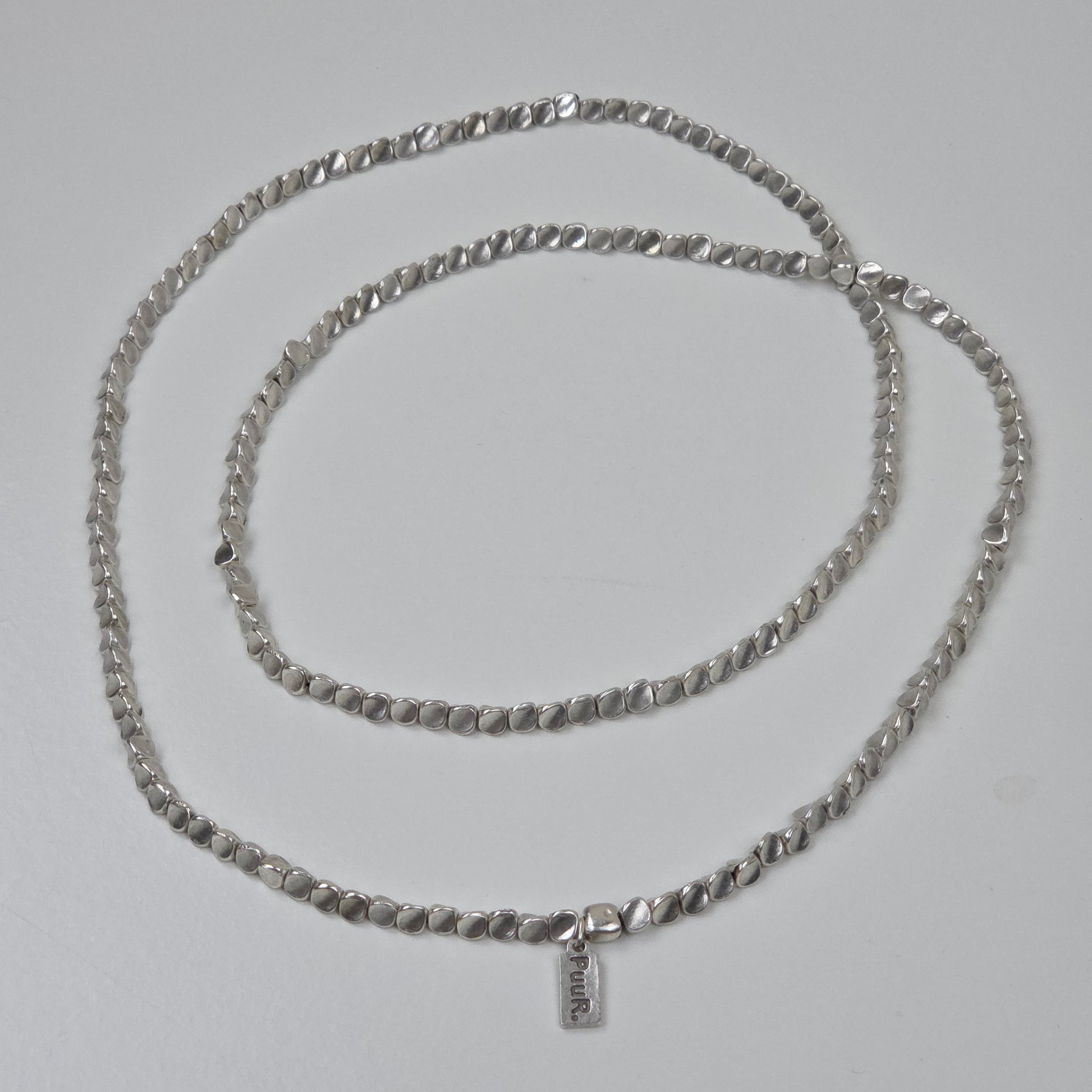 Introductie: De PUUR Heartline Ketting is een handgemaakt sieraad met een subtiel maar opvallend design. De lange zilverkleurige ketting bestaat uit kleine hartvormige schakels die samen een elegante en speelse uitstraling creëren. Perfect om solo te dragen of te combineren met andere kettingen voor een gelaagde look.