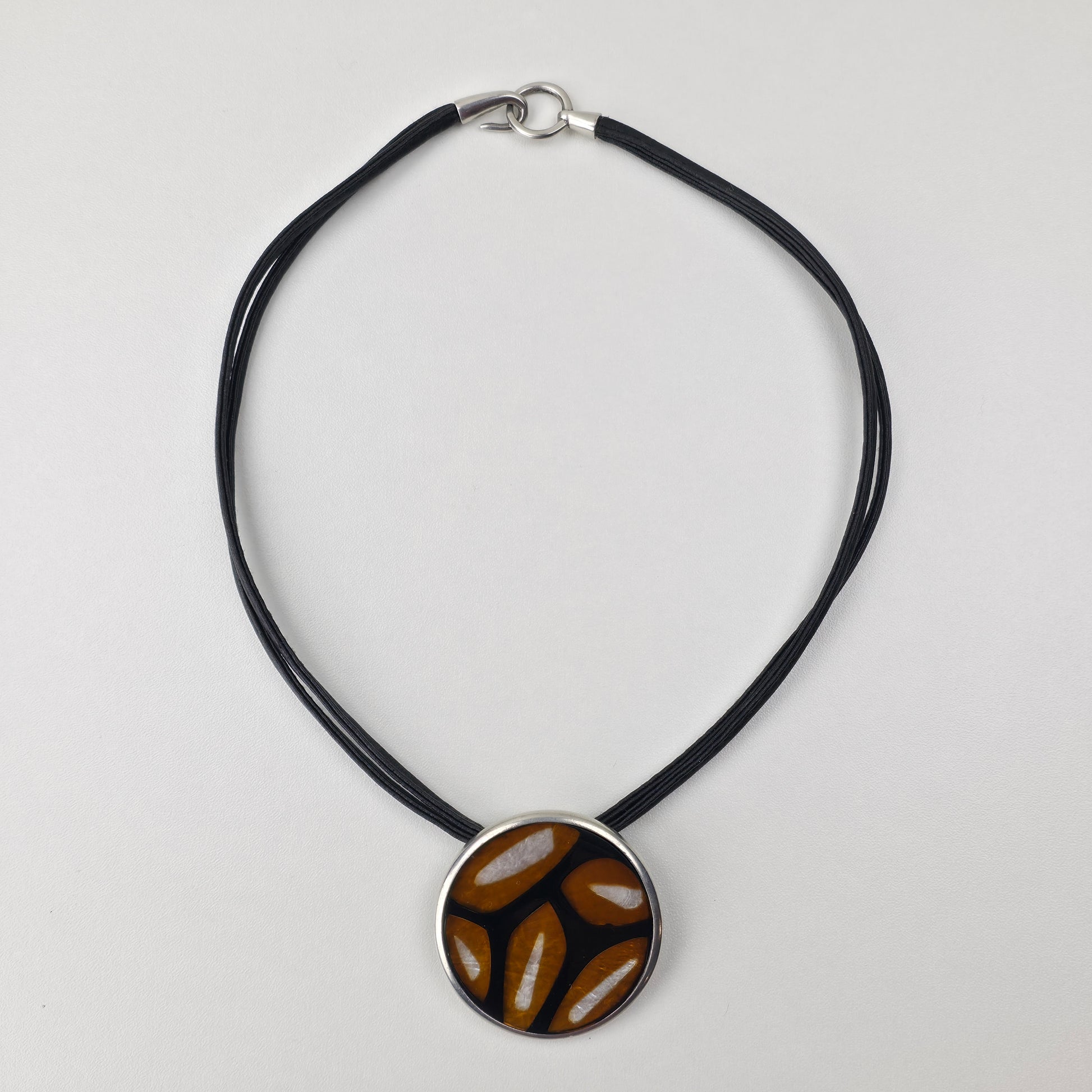 Productdetails: • Type: Ketting. • Lengte: 45 cm. • Materiaal: Combinatie van aluminium, hars (resin), schelp en leer. • Hanger: Ronde hanger met organisch patroon. • Kleurvarianten: Bruin/Zwart en Olijfgroen/Zwart. • Koord: Zwart leer, meerstrengs. • Sluiting: Ring- en haaksluiting (metaal). • Stijl: Modern / Artistiek.